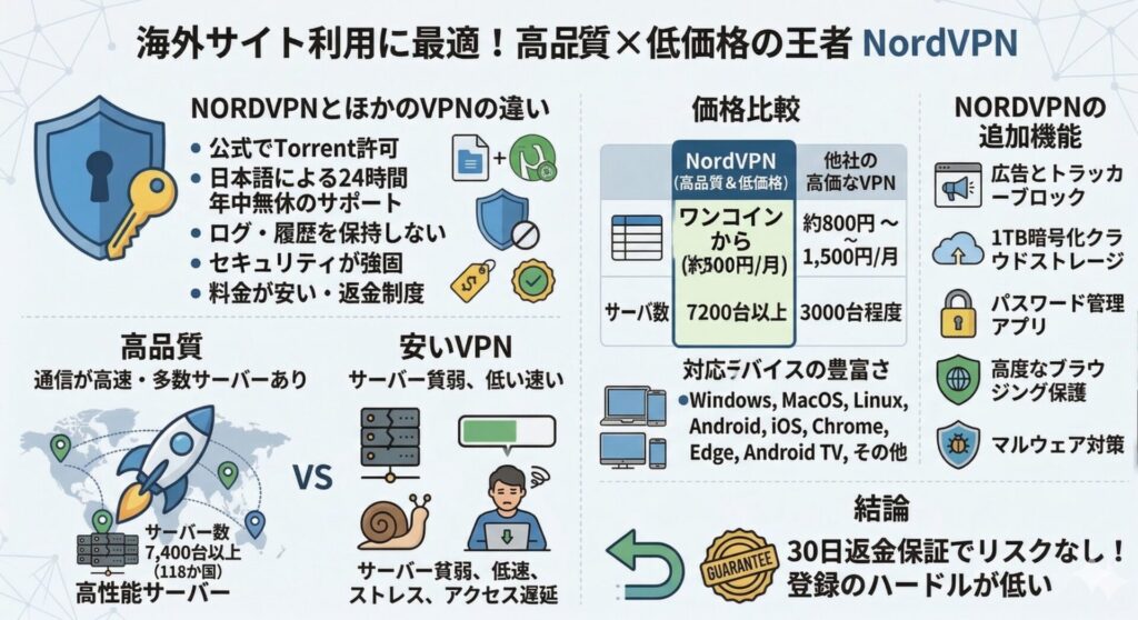 30日間の返金保証があるため、万が一「自分の環境では速度が出ない」と感じてもノーリスクで解約可能です。海外サイトを利用する前に、まずはこの「安心」を試してみてください。 |