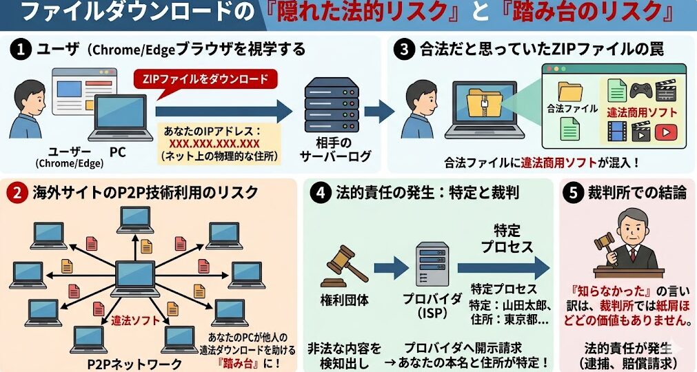 さらに、多くの海外サイトは「P2P(ピア・ツー・ピア)」に近い技術を裏側で利用しており、ダウンロード中にあなたのPCが他人の違法ダウンロードを助ける「踏み台」にされるケースすらあります。