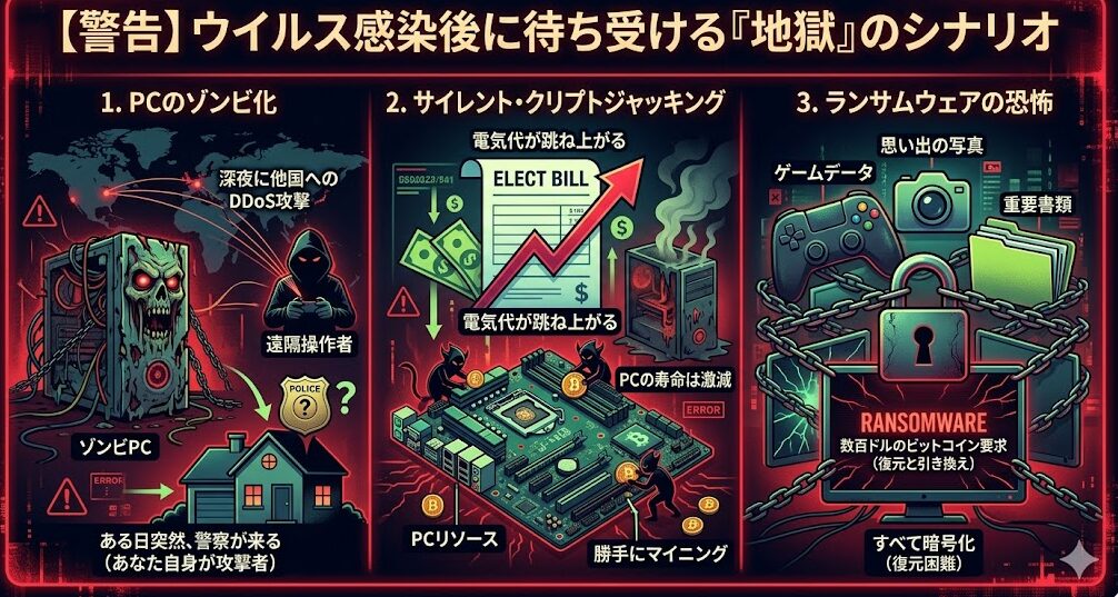 - PCのゾンビ化:あなたのPCが遠隔操作され、深夜に他国へのDDoS攻撃(サイバー攻撃)に加担させられます。ある日突然、警察が来るのは「あなた自身が攻撃者」になっているからです。