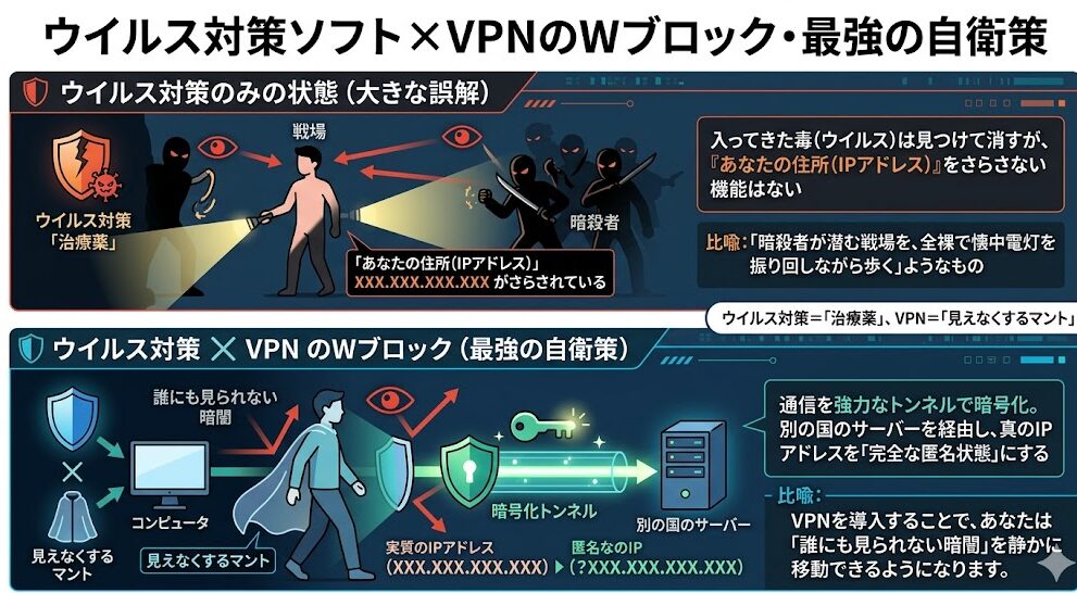 ウイルスソフトは「入ってきた毒」を見つけて消そうとしますが、「あなたの住所(IPアドレス)を外部にさらさない」機能はありません。
